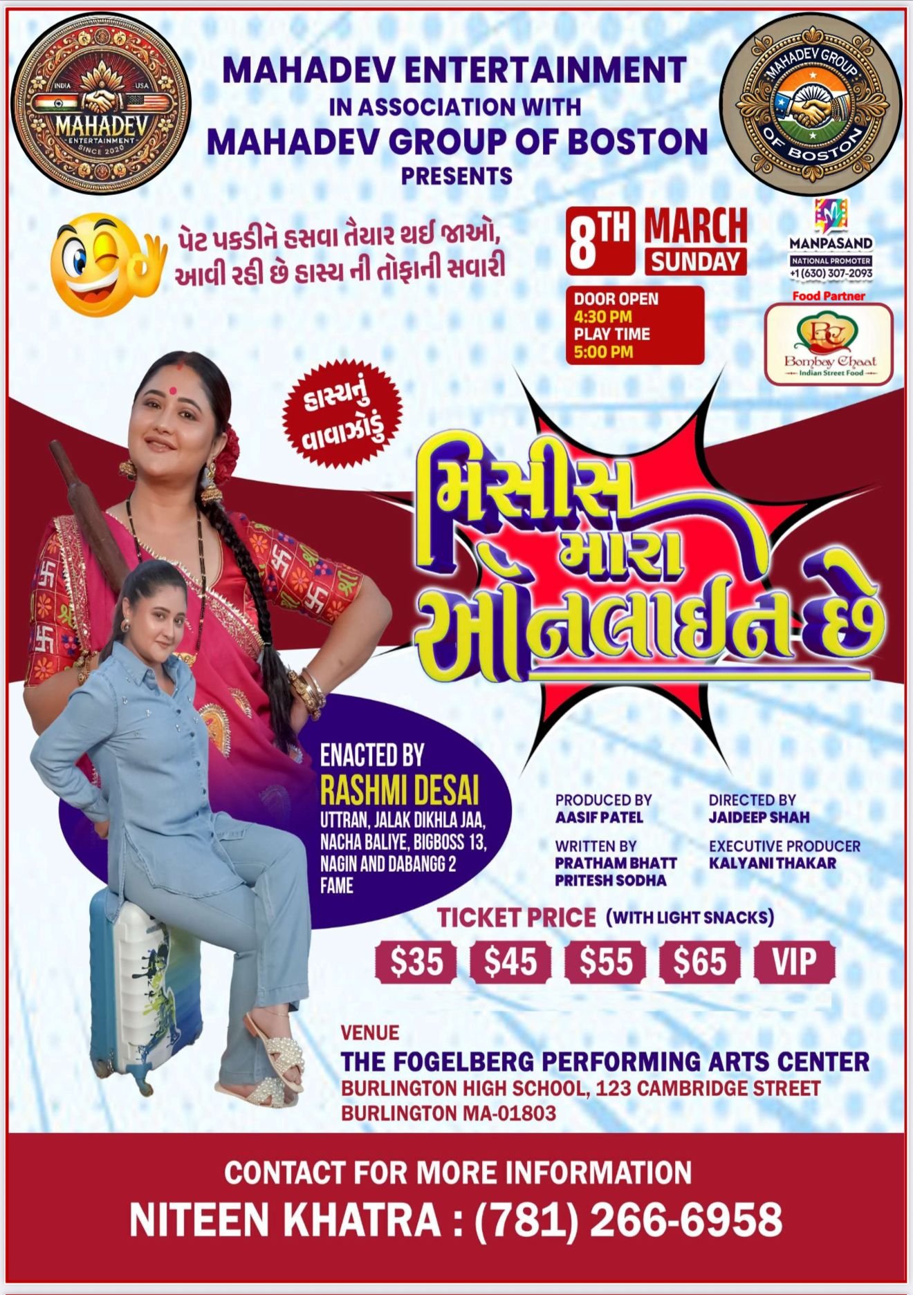 Mahadev Entertainment, in association with Mahadev Group of Boston, proudly presents the much-awaited Gujarati stage play “Mara Missus online chhe”, enacted by television star Rashmi Desai — known for her iconic roles in Uttaran, Jhalak Dikhhla Jaa, Nach Baliye, Bigg Boss 13, Naagin, and Dabangg 2 fame.
