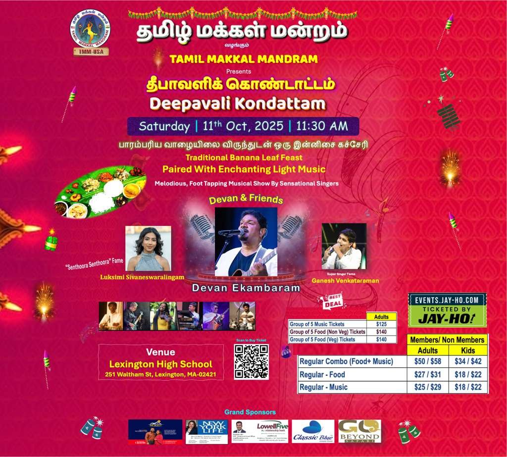 Celebrate the Festival of Lights the traditional way with Tamil Makkal Mandram (TMM-USA) at Deepavali Kondattam 2025! Enjoy a delicious banana leaf feast, festive vibes, and enchanting light music in a joyful community setting.